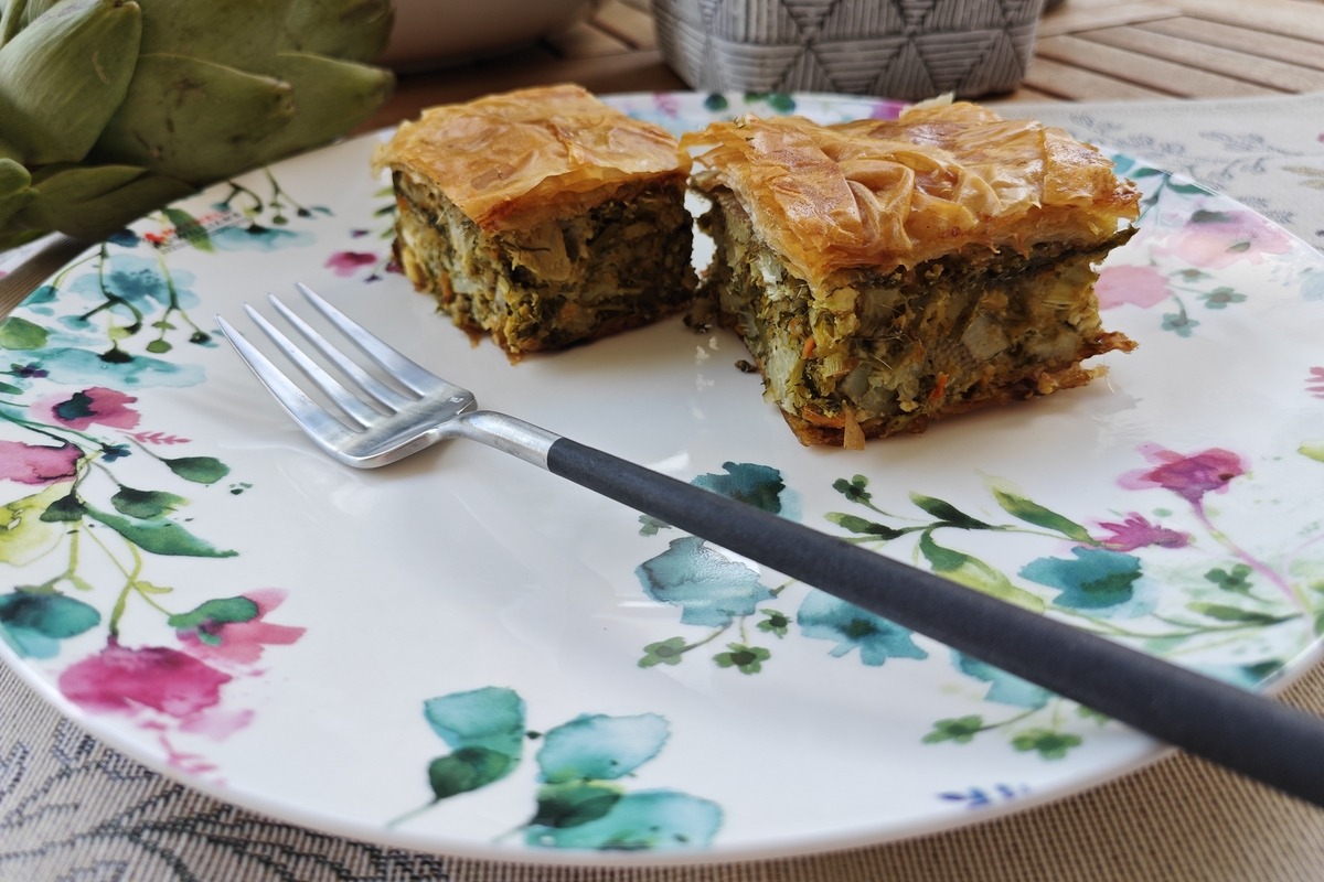 Αγκινάρες πίτα με τσιγαριστά μυρωδικά και πικάντικη φέτα.