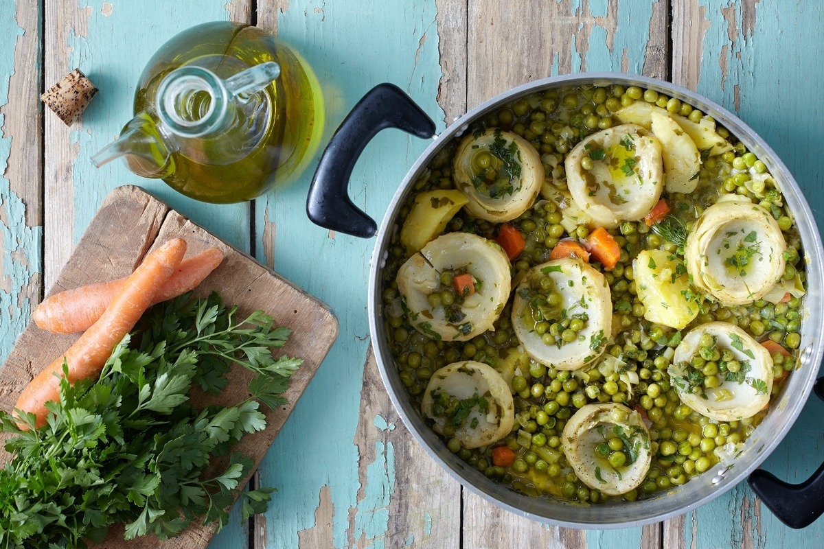 Αγκινάρες με φρέσκο αρακά και μυρώνια.