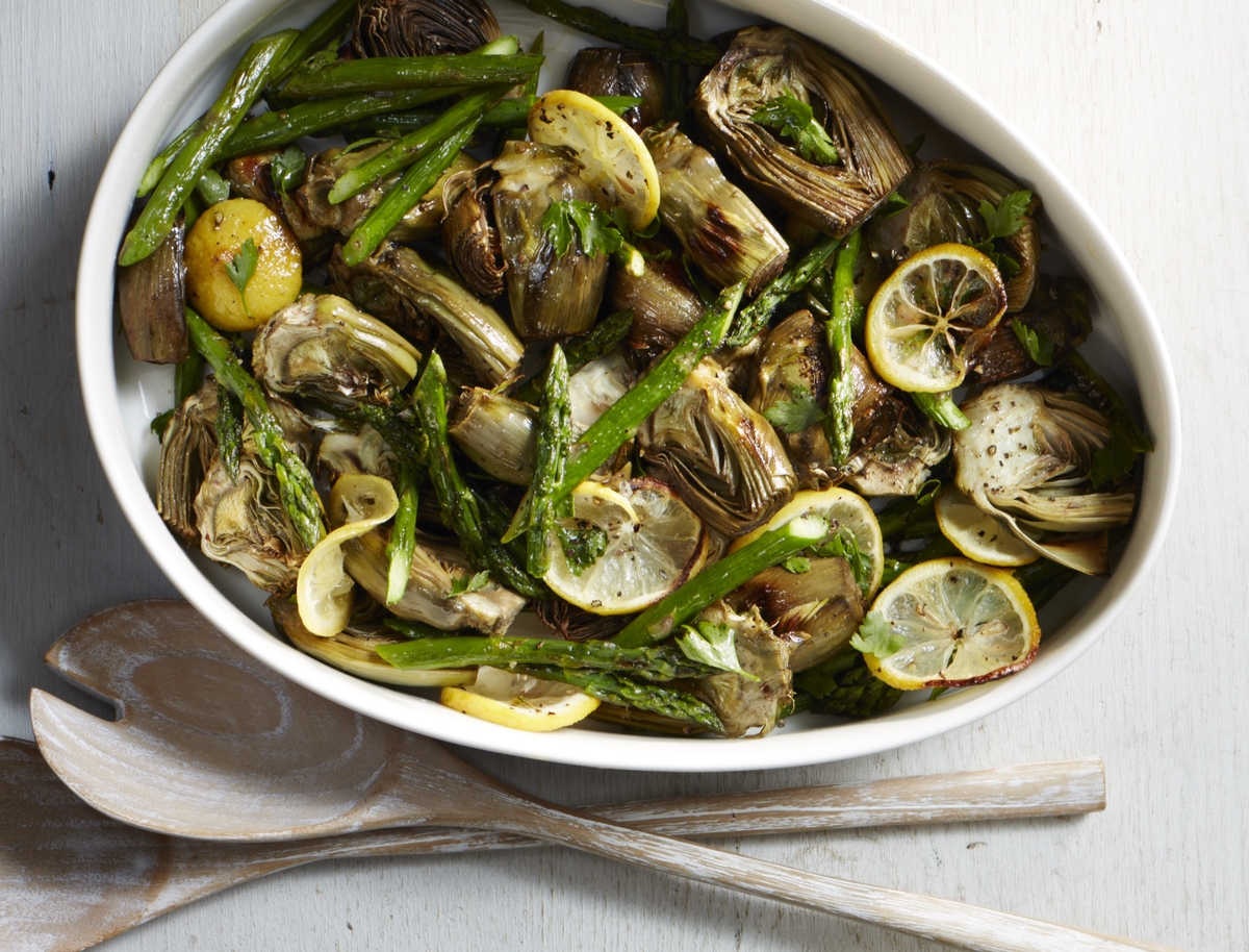 Αγκινάρες με σπαράγγια φουρνιστά.