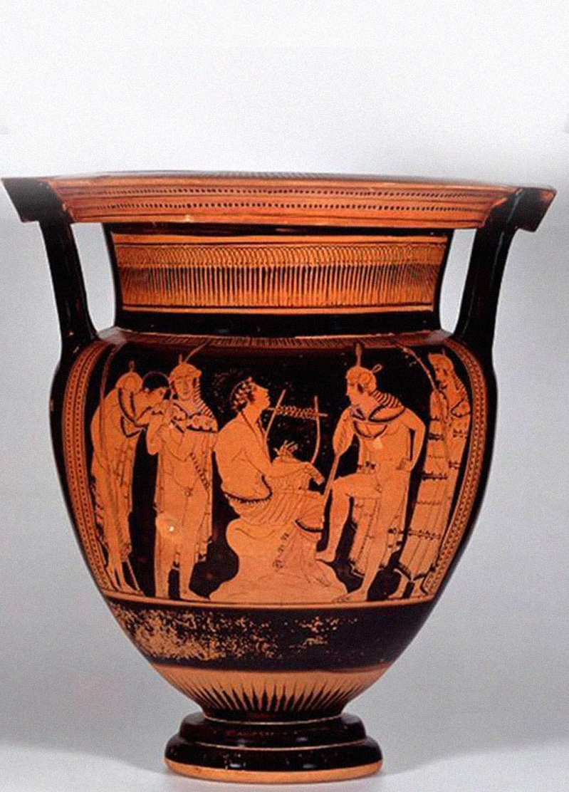 ΟΡΦΕΑΣ ΚΑΙ ΑΠΟΛΛΩΝΑΣ. (εικ. επάνω) Ο Ορφέας, που υπήρξε ιδρυτής του ορφικού βίου, εικονίζεται σε αυτή την αγγειογραφία του 5ου αι. π.κ.ε. να παίζει λύρα και να τραγουδά καθισμένος σε βράχο. Ο ορφικός βίος σχημάτιζε έναν δρόμο στο τέλος του οποίου ο μαθητής έβγαινε μεταμορφωμένος σε μύστη. Σύμφωνα με τον Ερατοσθένη, ο Ορφέας δεν τιμούσε τον Θεό Διόνυσο αλλά τον Θεό Απόλλωνα. Για τον λόγο αυτό κατακρεουργήθηκε από τις Μαινάδες. Οι Μούσες περισυνέλεξαν τα κομμάτια του σώματός του και τα έθαψαν στο Δίον, την ιερή πόλη των Μακεδόνων.