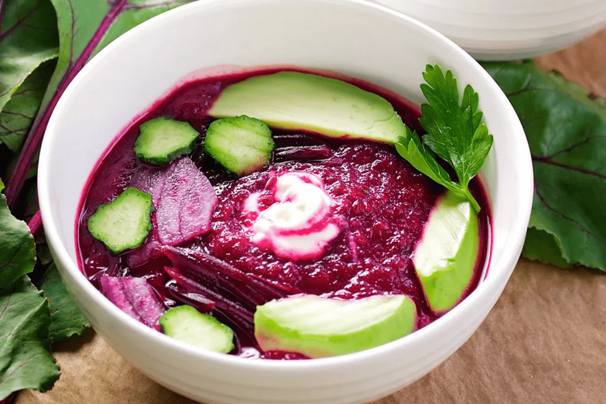 Αυτό το νόστιμο τεύτλο Gazpacho είναι απλό και εύκολο να φτιαχτεί και γεμάτο με υγιεινά φρέσκα συστατικά το καλοκαίρι. Μια παγωμένη σούπα τεύτλων, με αβοκάντο σε κύβους, τραγανό αγγούρι, κρεμμύδι, τεύτλα και φρέσκο άνηθο και πολύ προαιρετικό ψιλοκομμένο ελαιόλαδο ή στροβιλισμό γιαουρτιού. Για τον ουρανίσκο μου, τα τεύτλα είναι τόσο μεταξένια φυσικά, δεν χρειάζονται επιπλέον λίπος, αλλά δοκιμάστε το μόνοι σας και δείτε.