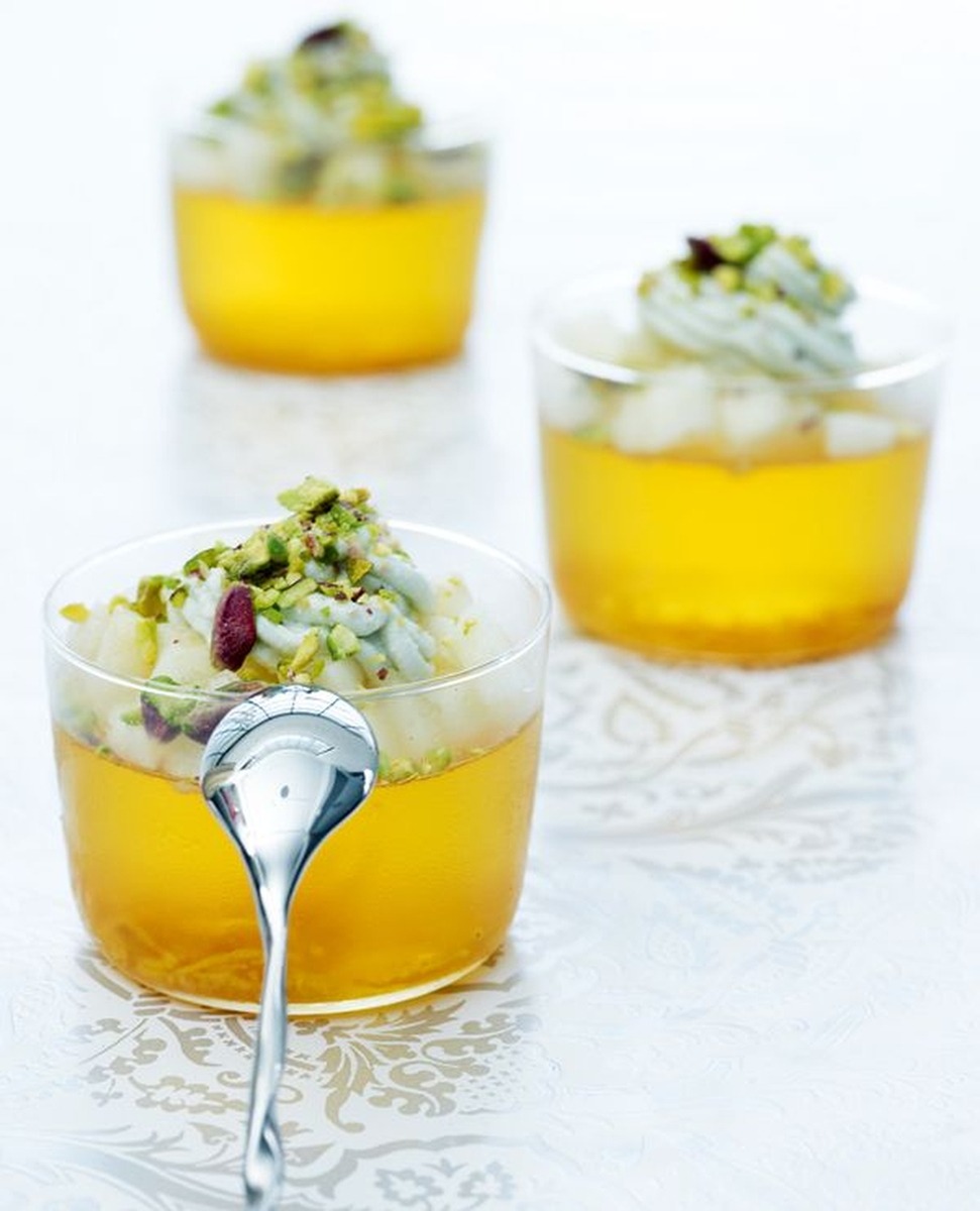 Ετοιμάζετε την κρέμα: Αφήνετε τα τυριά σε θερμοκρασία δωματίου για 1 ώρα. Τα ανακατεύετε στο μίξερ μαζί με την κρέμα γάλακτος μέχρι να γίνουν ένα ομοιογενές κρεμώδες μίγμα. Ρίχνετε φρεσκοτριμμένο πιπέρι (αλάτι δεν βάζετε γιατί το Roquefort είναι αρκετά αλμυρό). Καθαρίζετε και κόβετε τα αχλάδια σε κύβους και τα περιχύνετε με ελάχιστο χυμό λεμονιού για να μη μαυρίσουν. Παίρνετε τα ποτήρια με το ζελέ και σκεπάζετε την επιφάνειά του με τα αχλάδια. Βάζετε την κρέμα σε κορνέ και την μοιράζετε πάνω από το ζελέ με τα αχλάδια. Πασπαλίζετε με τα φιστίκια ή τα καρύδια. Διατηρείτε στο ψυγείο. Πριν σερβίρετε, αφήνετε τα ποτήρια σε θερμοκρασία δωματίου για 10 λεπτά.