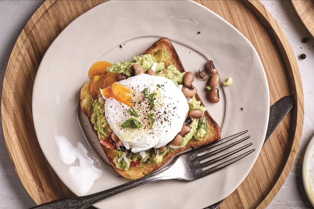Σύνθεση: Λαδώνουμε τις φέτες ψωμιού και τις φρυγανίζουμε σε προθερμασμένο φούρνο στους 170° C. Τις αφαιρούμε από τον φούρνο και τις αφήνουμε να κρυώσουν. Αλείφουμε το φρυγανισμένο ψωμί με το Γουακαμόλε/Roquefort. Τοποθετούμε από πάνω από ένα αυγό ποσέ και μαυρομάτικα φασόλια. Γαρνίρουμε με φύλλα βασιλικού, ντοματίνια και ελαιόλαδο και σερβίρουμε αμέσως.
