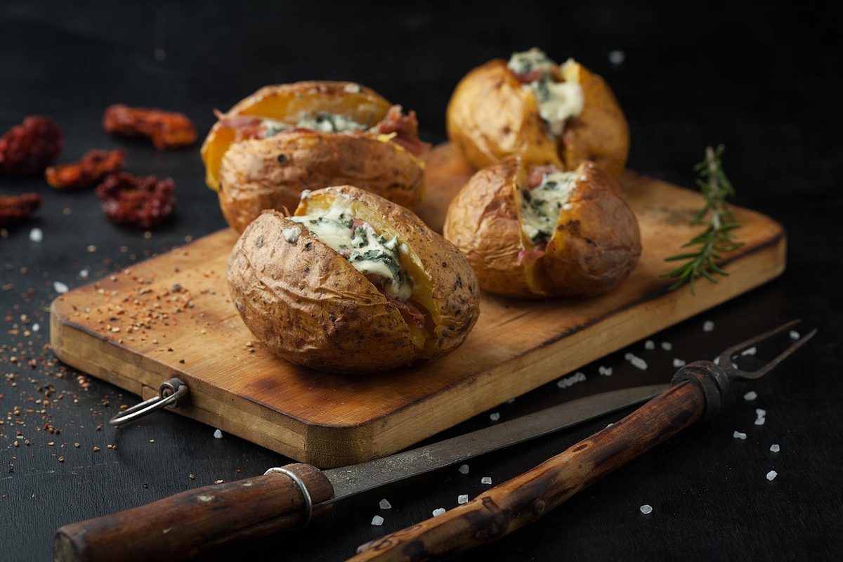 Πατάτες ψητές με σάλτσα Roquefort και τραγανό μπέικον