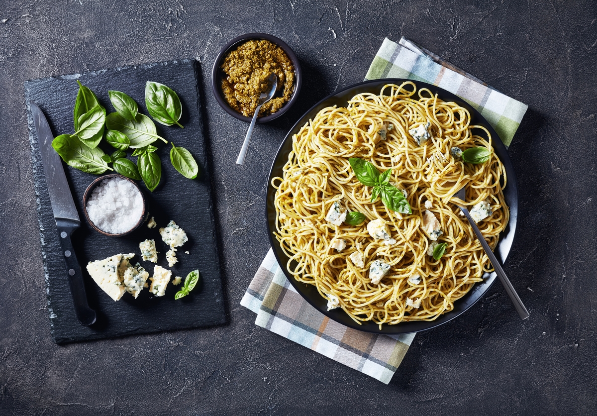 Σπαγγέτι με ροκφόρ & πέστο φουντουκιού.