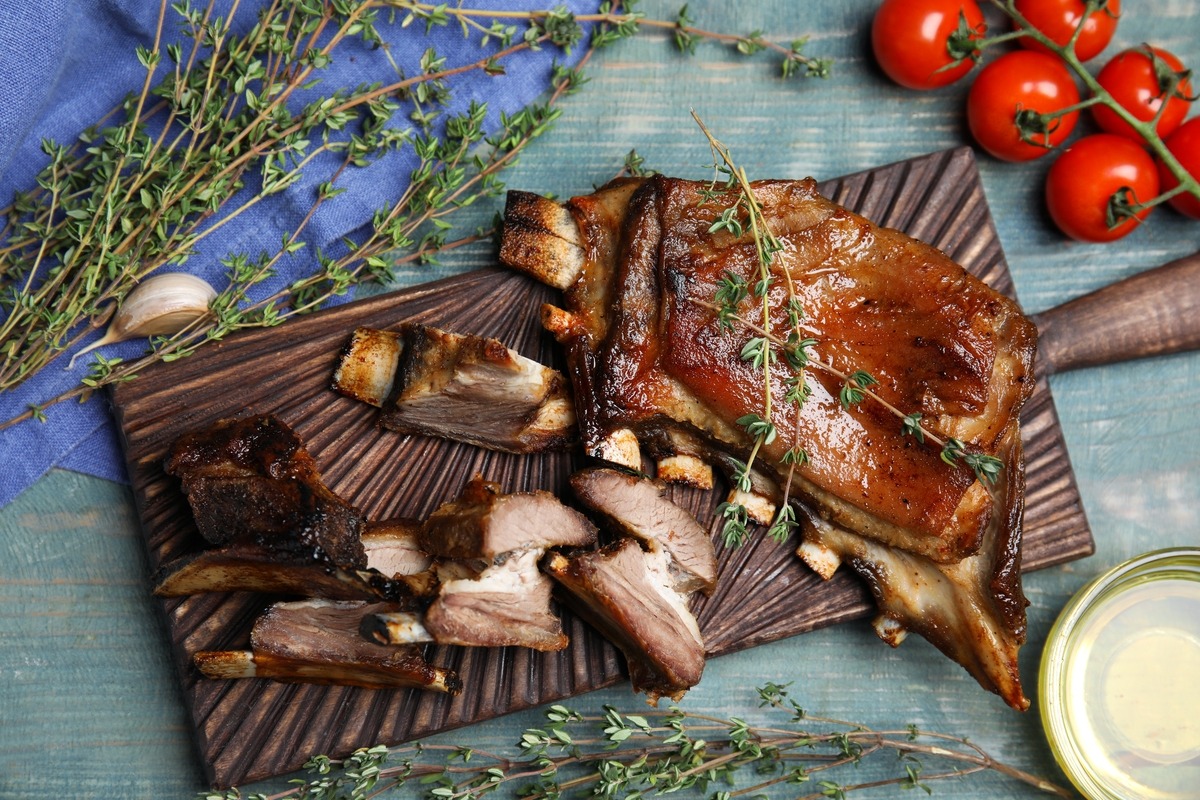 Κόβουμε σε μερίδες ανάμεσα από τα κόκαλα και σερβίρουμε με πιλάφι, ή mejadra σε όποια εκδοχή θέλουμε, γαρνίρουμε με δεντρολίβανο και κρέμα βαλσάμικο.