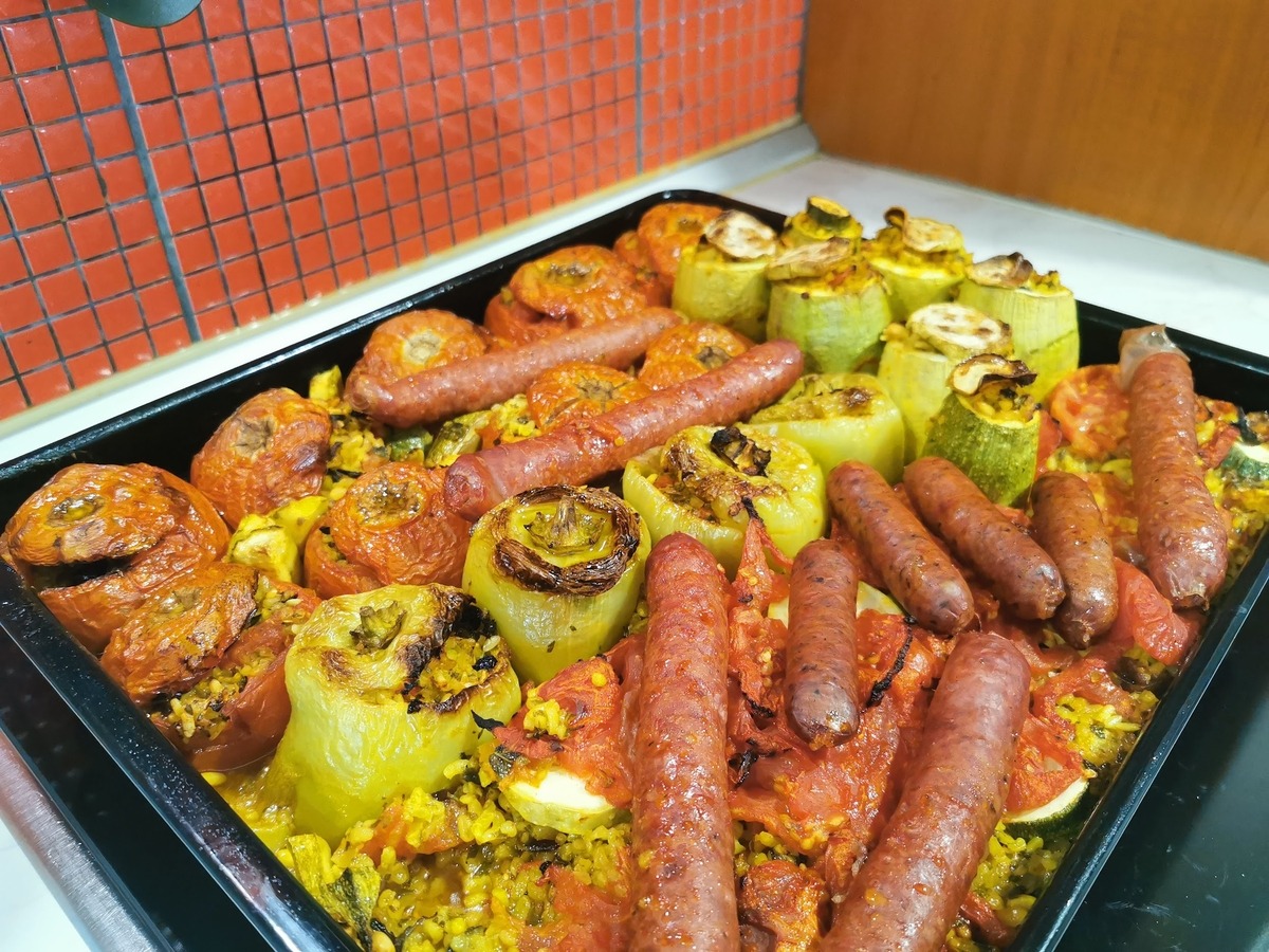 Στην μέση του ψησίματος μπορείς να βάλεις μερικά, σπιτικά, λουκάνικα τρυπημένα με το πιρούνι και μέχρι να γίνει το φαγητό θα έχουν γίνει κι αυτά. Τα τοποθετείς στο πιάτο που σερβίρεις και τα ραντίζεις με λεμόνι. Δίνουν απίστευτη και φίνα νοστιμιά στα γεμιστά. Δες την φωτογραφία πιο κάτω.