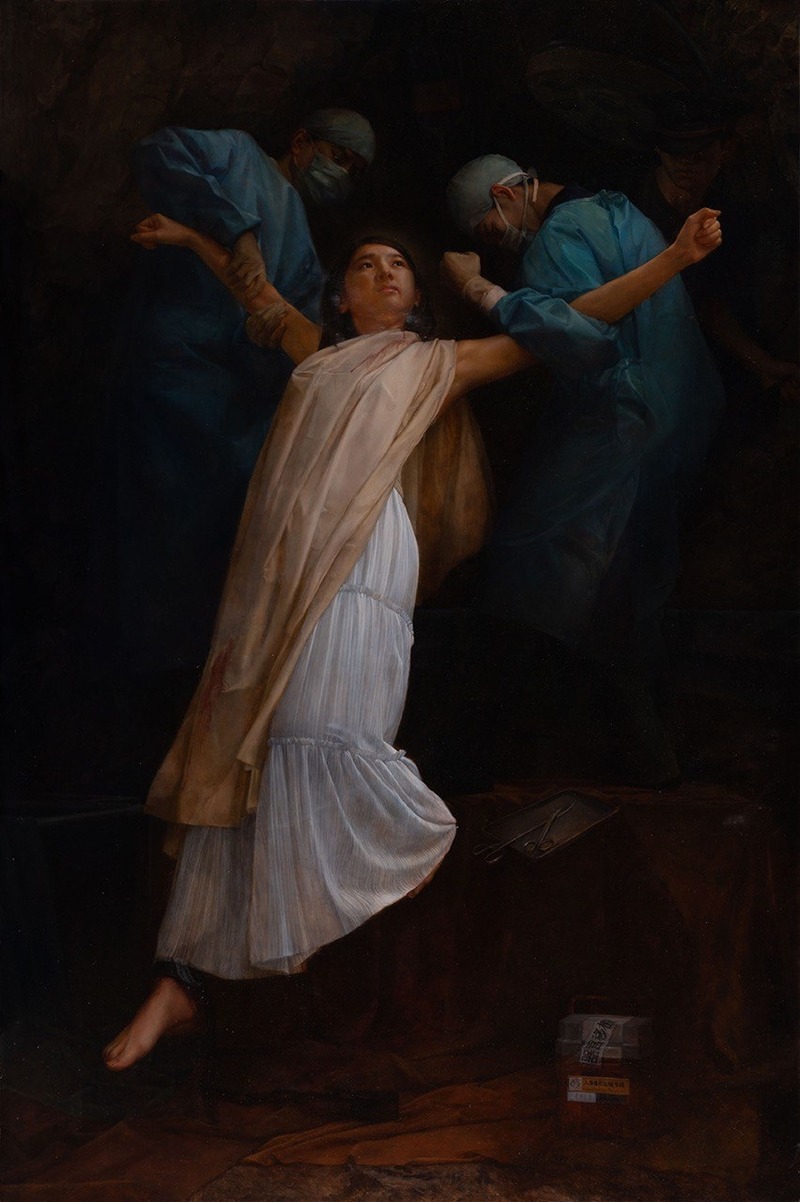 Χουνγκ Γιου Τσεν, «Ασκούμενη του Ντάφα, που υφίσταται εξαναγκαστική αφαίρεση οργάνων». Ο πίνακας απεικονίζει μια ασκούμενη του Φάλουν Ντάφα, η οποία έχει φυλακιστεί για την πίστη της, την ώρα που την παίρνουν οι γιατροί δια της βίας για να αφαιρέσουν τα ζωτικά της όργανα, ενώ αυτή είναι ακόμα εν ζωή και υγιής. Έπαινος στον Διεθνή Διαγωνισμό Προσωπογραφίας του NTD το 2019. (NTD International Figure Painting Competition / NIFPC)