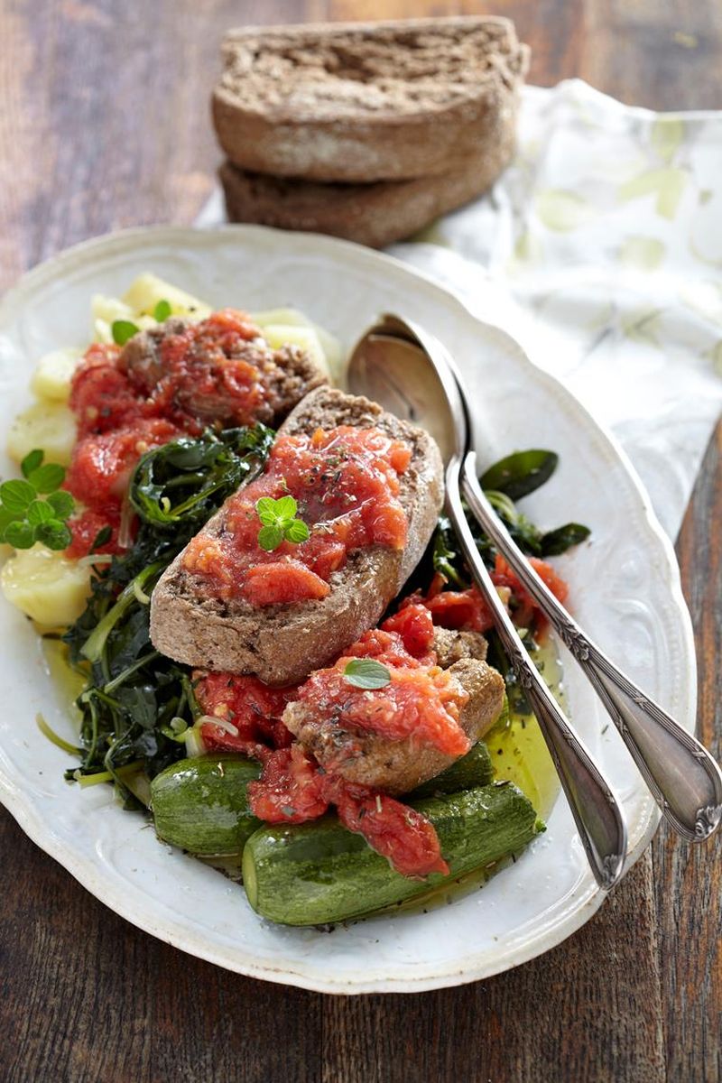 Ρίχνουμε το μείγμα πάνω στον ντάκο και από πάνω ραντίζουμε με αγουρέλαιο.