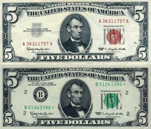 Σύγκριση ενός “United States Note” (επάνω) όπως εκδίδεται από την κυβέρνηση των ΗΠΑ και ενός κανονικού “Federal Reserve Note” (κάτω) όπως εκδίδεται από τη Fed. Παρόλο που τα χαρτονομίσματα είναι αισθητικά παρόμοια, το United States Note δεν έχει χρέος, δεν έχει τόκους και παρακάμπτει ολόκληρο το παρασιτικό Federal Reserve System.