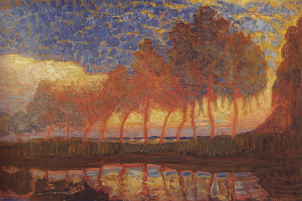 Στο Gemeentemuseum Den Haag εκτίθενται πολλοί πίνακες αυτής της περιόδου, συμπεριλαμβανομένων μετα-ιμπρεσιονιστικών έργων όπως The Red Mill και Trees in Moonrise. Ένας άλλος πίνακας, το Evening (Avond) (1908), που απεικονίζει ένα δέντρο σε ένα χωράφι το σούρουπο, προμηνύει ακόμη και μελλοντικές εξελίξεις χρησιμοποιώντας μια παλέτα που αποτελείται σχεδόν εξ ολοκλήρου από κόκκινο, κίτρινο και μπλε. Αν και το Avond είναι περιορισμένα αφηρημένο, είναι ο πρώτος πίνακας του Mondrian που δίνει έμφαση στα βασικά χρώματα.