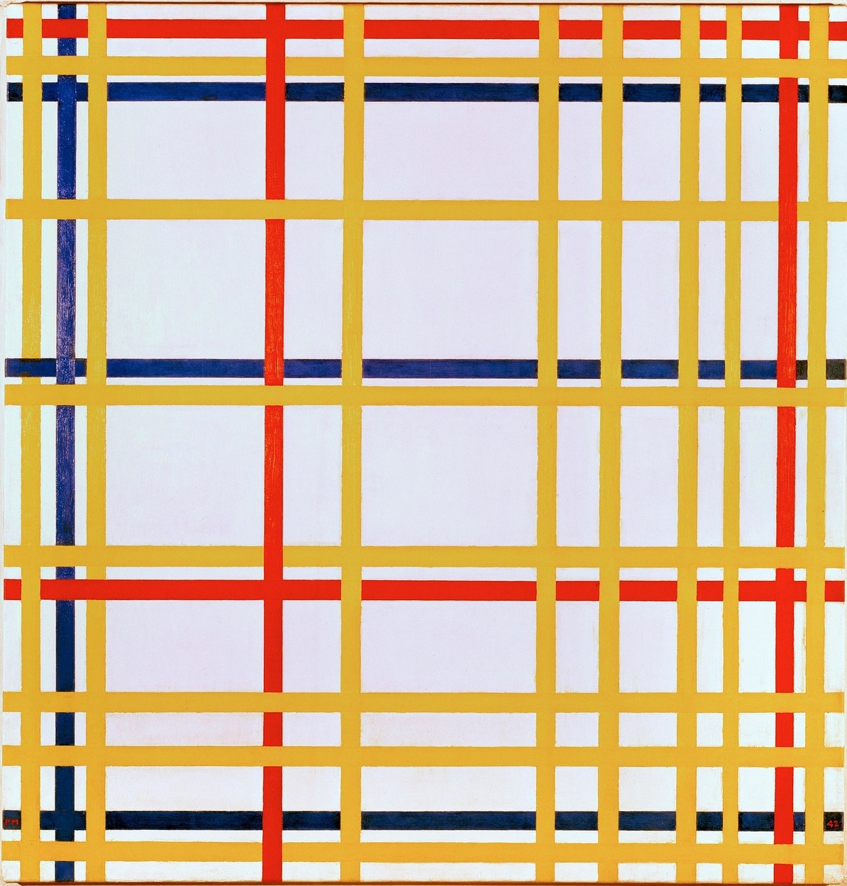 Οι νέοι καμβάδες που ξεκίνησε ο Mondrian στο Μανχάταν είναι ακόμη πιο εντυπωσιακοί και υποδηλώνουν την αρχή ενός νέου ιδιώματος που κόπηκε απότομα από τον θάνατο του καλλιτέχνη. Η Νέα Υόρκη (1942) είναι ένα περίπλοκο πλέγμα από κόκκινες, μπλε και κίτρινες γραμμές, που περιστασιακά συμπλέκονται για να δημιουργήσουν μια μεγαλύτερη αίσθηση βάθους από τα προηγούμενα έργα του.