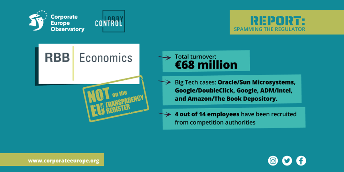 Η RBB Economics είναι μία εταιρεία οικονομικών συμβούλων, η οποία συνεργάζεται με μερικές από τις μεγαλύτερες εταιρείες στον κόσμο για να προωθήσει τις συγχωνεύσεις και τις εξαγορές. Η εταιρεία συμμετείχε σε πολλές από τις πιο αμφιλεγόμενες συγχωνεύσεις υψηλού προφίλ στην πρόσφατη ιστορία. Επίσης, η RBB Economics ασκεί επί χρόνια πιέσεις υπέρ της αδύναμης επιβολής των κανόνων της ΕΕ όσον αφορά τις συγχωνεύσεις και κατά των βασικών διατάξεων του νόμου για τις ψηφιακές αγορές, ο οποίος στοχεύει να χαλιναγωγήσει την μονοπωλιακή δύναμη της Big Tech.