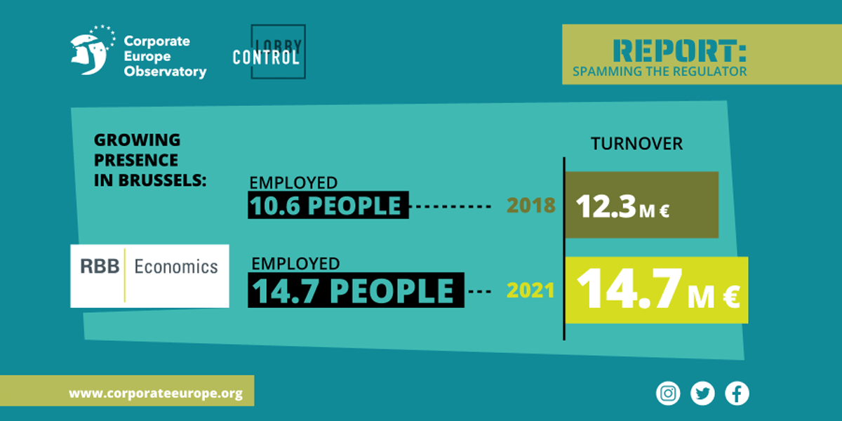 Η παρουσία συμβούλων ανταγωνισμού στις Βρυξέλλες όπως η RBB Economics έχει αυξηθεί σημαντικά. Ο συνδυασμένος κύκλος εργασιών της RBB Economics, της Compass Lexecon και της Charles River Associates στην ΕΕ (παρόμοιες εταιρείες συμβούλων ανταγωνισμού) αυξήθηκε από 27,9 εκατομμύρια ευρώ το 2018 σε 34,6 εκατομμύρια ευρώ το 2021.
