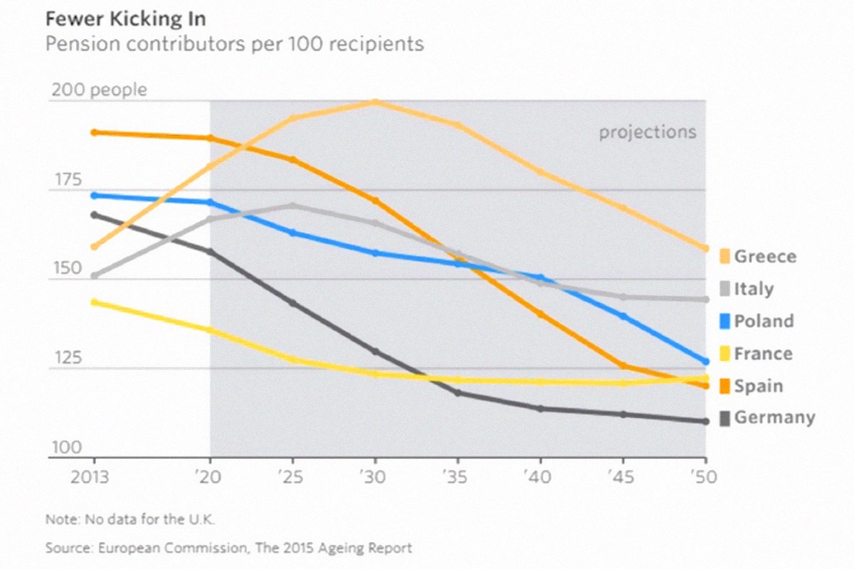 Υπάρχουν 1,1 εκατομμύρια περισσότεροι συνταξιούχοι από ό, τι πριν από μόλις 10 χρόνια. Και καθώς όλο και αυξάνονται οι συνταξιούχοι, το πρόβλημα θα μεγαλώνει αφού θα υπάρχουν λιγότεροι εργαζόμενοι για να τους υποστηρίξουν. Με ποσοστό ανεργίας 25% μεταξύ των νέων εργαζομένων το σύστημα δεν μπορεί να ανταποκριθεί. Με πιλοτικό πρόγραμμα την Ελλάδα οι «ειδικοί» φωνάζουν πως υπάρχουν «πολλές» χώρες που έχουν συνταξιούχους σε ηλικία κάτω των 60 ετών. Για την εργασία και την παραγωγή δεν μιλάει κανένας ειδικός.