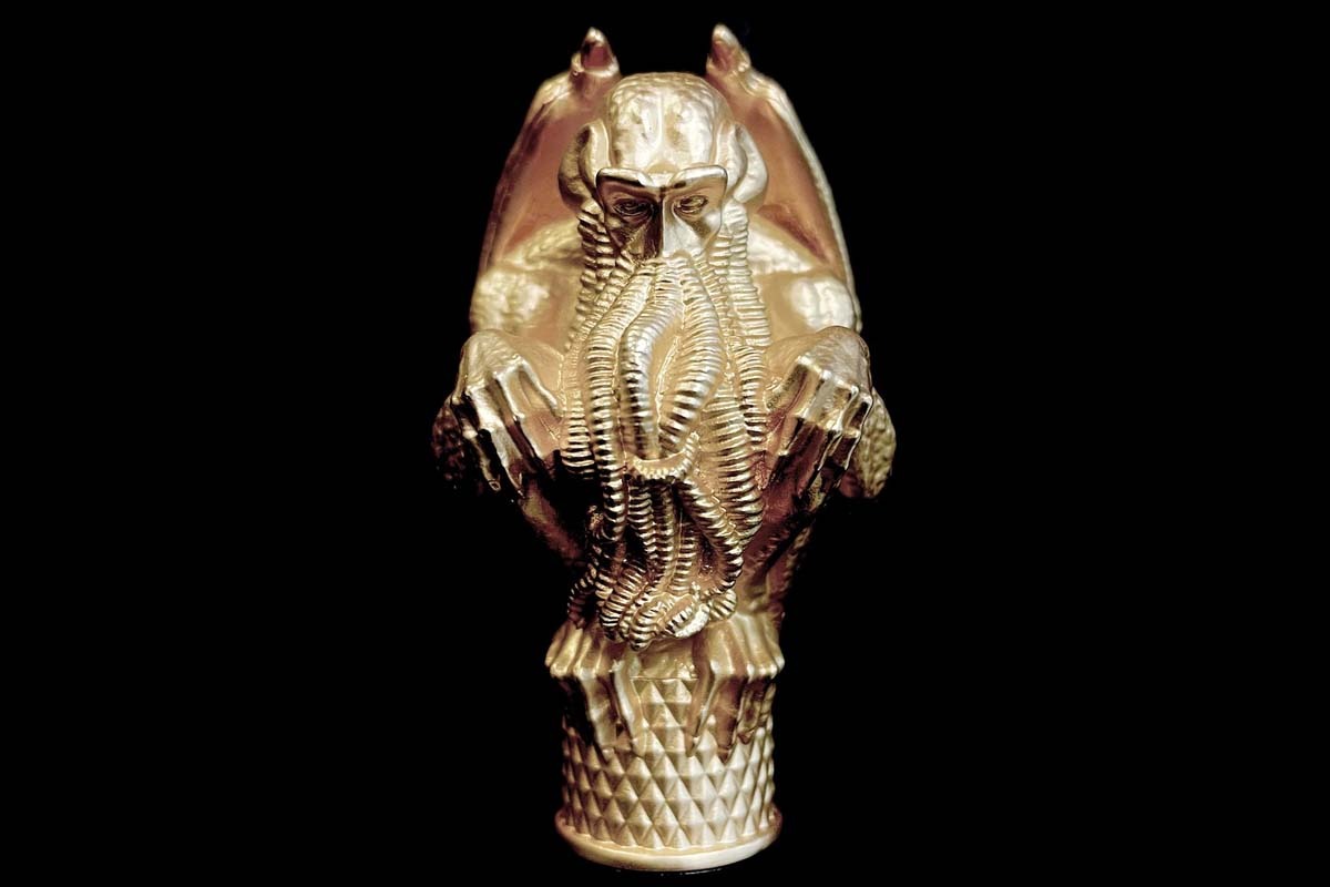 Το άγαλμα, που ευλαβικά πέρασε από χέρι σε χέρι για προσεκτική μελέτη, ήταν εφτά ή οχτώ ίντσες ψηλό και σμιλεμένο με εξαιρετική δεξιοτεχνία. Απεικόνιζε κάποιο τέρας, αόριστα ανθρωπόμορφο, με χταποδίσιο κεφάλι, το πρόσωπο του οποίου ήταν μια μάζα από λεπτά πλοκάμια. Το κορμί έδειχνε φολιδωτό και λαστιχοειδές οπλισμένο με πελώριες δαγκάνες στα μπροστινά και στα πίσω πόδια, ενώ έφερε δύο στενόμακρες υποτυπώδεις φτερούγες στην ράχη. Ήταν ένα πλάσμα, που φαινόταν να αποπνέει μια φοβερή και αφύσικη μοχθηρία και το κάπως πρησμένο κορμί του κούρνιαζε κακόβουλα σ ένα παραλληλόγραμμο ογκόλιθο ή βάθρο σκεπασμένο με ανακρυπτογράφητα σύμβολα.