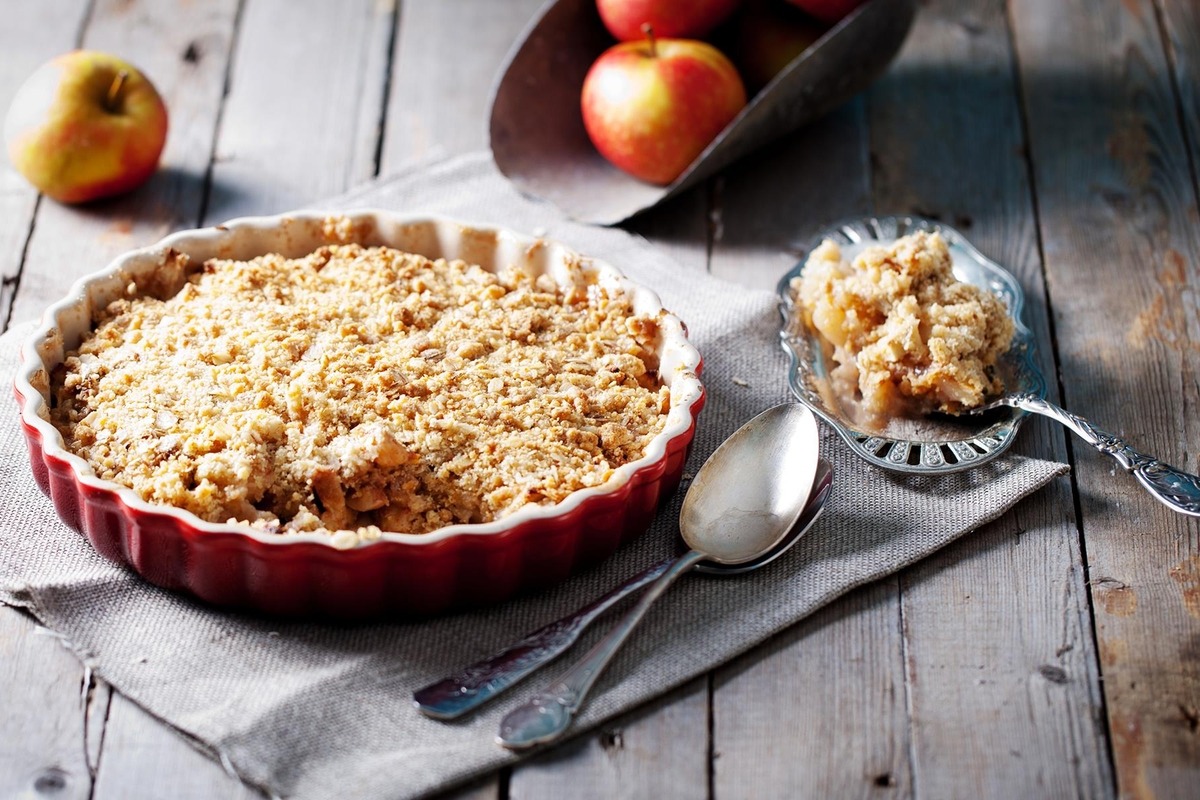 Ψήνουμε σε προθερμασμένο φούρνο στους 180oC για 40-50 περίπου λεπτά. Σερβρίρουμε το apple crumble ζεστό με μια μπάλα παγωτό βανίλια ή με κρέμα ανγκλαίζ.