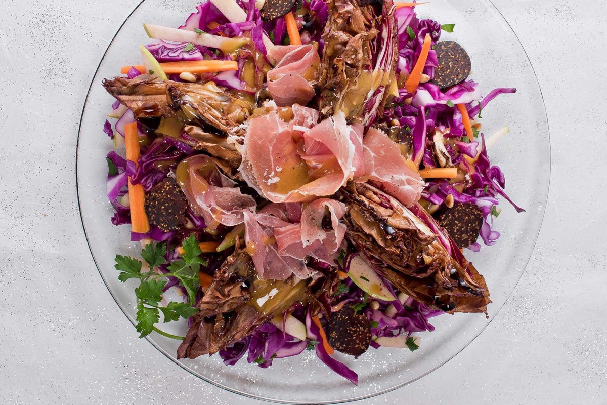 Σαλάτα με ξινόμηλο, κόκκινο λάχανο, κουκουνάρι & ξερά σύκα.